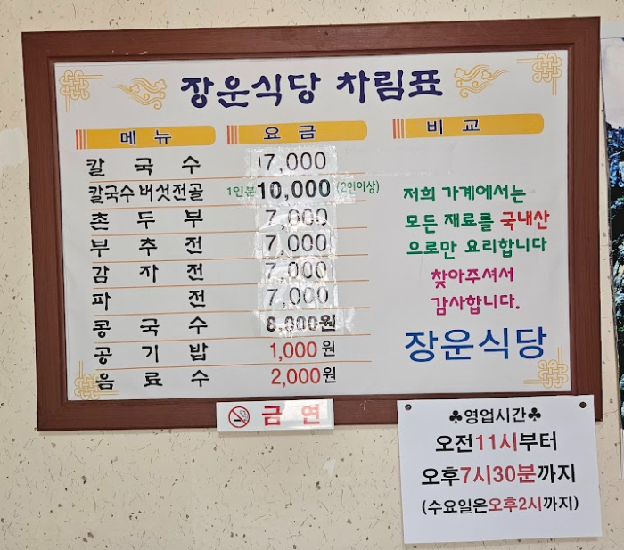 장운식당의 메뉴판입니다.