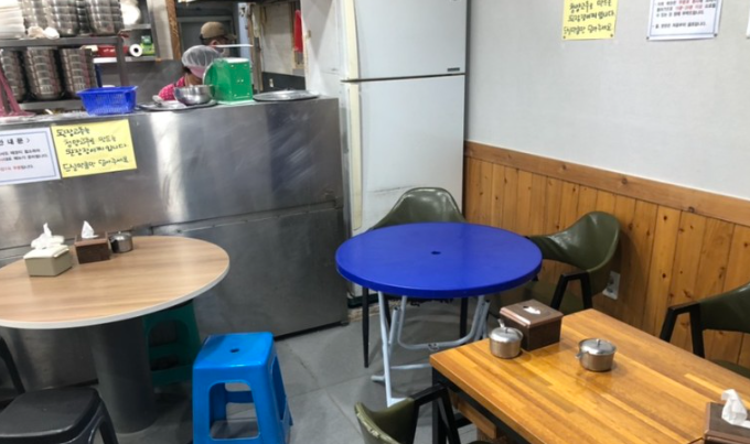 식당내부에 나무테이블도 있지만 간이 테이블과 간이 의자에도 앉을 수 있습니다.