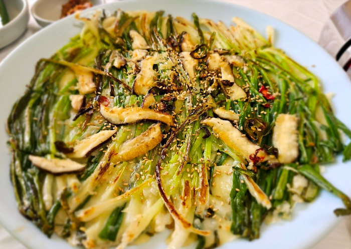 간장에 살짝 찍어서 먹으면 아삭이는 파와 향긋한 버섯의 조화로운 맛이 일품입니다.