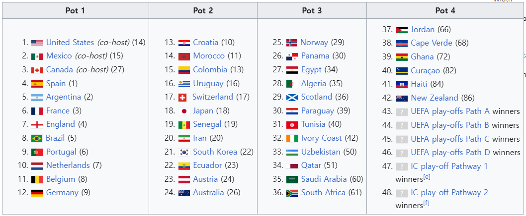- 포트4: 요르단, 카보베르데, 가나, 퀴라소, 아이티, 뉴질랜드 + UEFA 플레이오프 A/B/C/D 승자 4팀 + FIFA 플레이오프 2팀(경로 1·2) 월드컵 포트 자세히 보기
