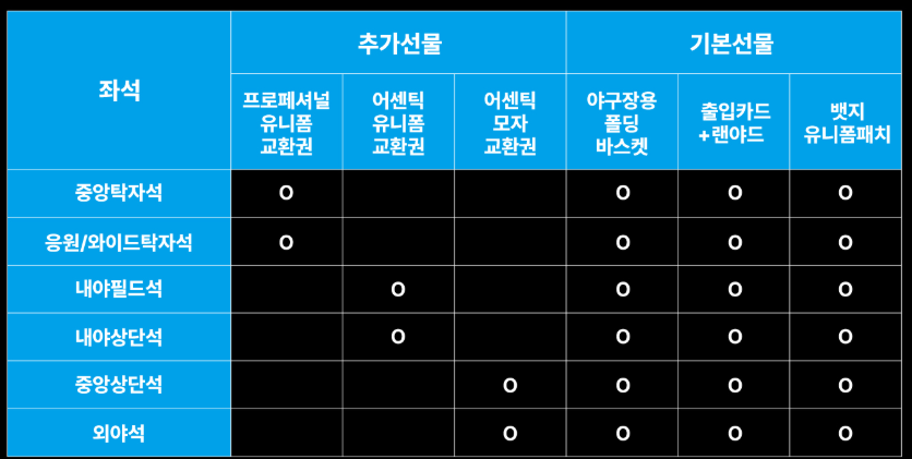 통합 멤버십 구매자에게는 좌석별 구매 상품에 따라 폴딩바스켓, 25시즌권 엠블럼 패치, 로고 배지, 시즌권 카드, 스트랩 끈, 좌석 네이밍 스티커와 프로페셔널 유니폼, 어센틱 유니폼, 어센틱 모자, 바시티 재킷을 증정합니다.