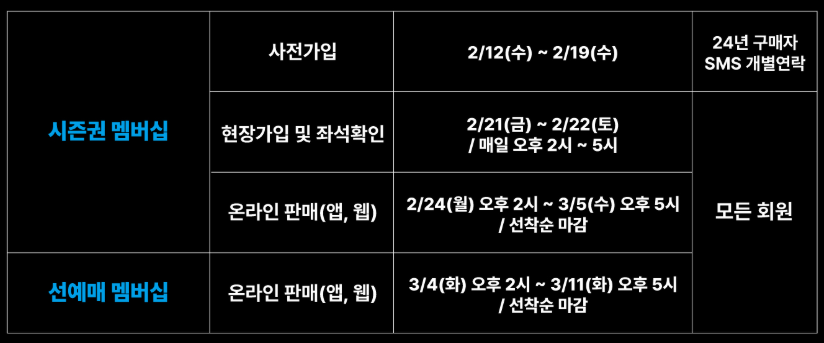 작년과 다른게 시즌권이 멤버십으로 통합되었습니다. 통합멤버십은 기존 시즌권과 온라인 멤버십을 통합하여 시즌권, 선예매 멤버십을 구매할 수 있는 서비스입니다. 2024년 시즌 티켓 구매자는 2월 12일부터 2월 19일까지 유선을 통해 025 통합 멤버십을 신청할 수 있습니다. 현장판매는 2월 21일부터 2월 22일 오후 2시부터 오후 5시까지 사직야구장 내 2층 1루 매표소에서 실시합니다. 또한 온라인 판매는 2월 24일 오후 2시부터 3월 5일 오후 5시까지 진행합니다.