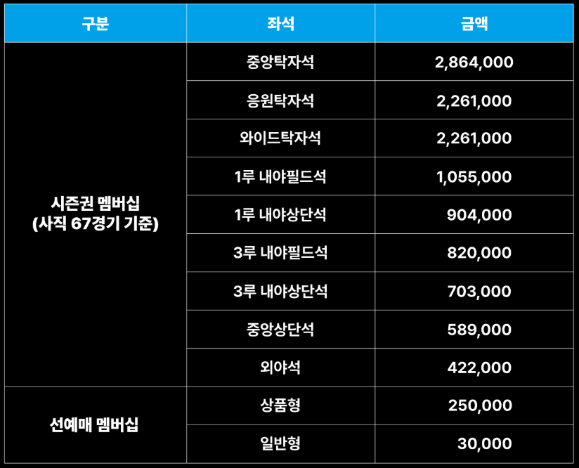 시즌권 멤버십 고객은 시즌 티켓 라운지 및 전용 게이트로 입장이 가능한 서비스를 받을 수 있으며, 정규시즌 사직 홈경기 메가 이벤트 행사 시 추가요금 없이 스페셜 기프트 혜택을 받을 수 있습니다.