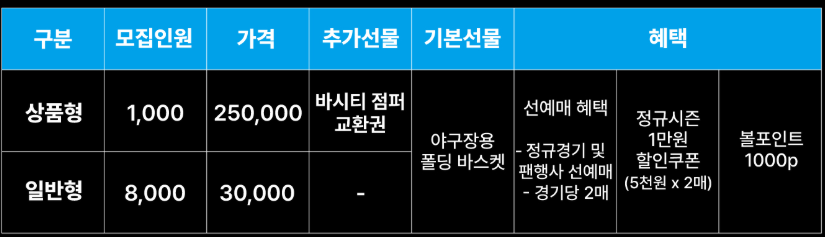 선예매권은 크게 두 가지로 나뉘어져 있습니다. 첫 번째는 일반형 선예매권으로 이 권한을 가진 팬들은 원하는 경기를 4시간 먼저 미리 예약할 수 있는 혜택을 누릴 수 있습니다. 그리고 정규시즌 1만 원 할인쿠폰이 지급되며 볼포인트 1000p인트도 챙길 수 있어요. 추가로 야구장용 폴딩바스켓도 지급이 된답니다. 볼포인트는 향후 볼포인트 샵에서 사용가능한데 운영 방안은 추후 공지합니다.