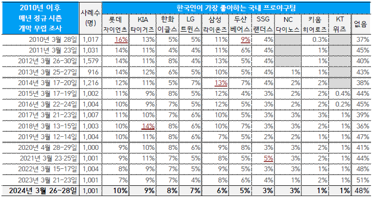 2024년 프로야구 구단 인기순위를 통해 각 구단이 팬들에게 얼마나 사랑받고 있는지를 확인해 봤습니다. 한국갤럽의 여론조사로 알아본 인기 순위는 표본이 그렇게 높지는 않지만 시청률, 관중수, 각종 스포츠 포털을 고려해 보았을때 개인적으로 구단 인기 순위는 정확도는 높다고 판단됩니다.