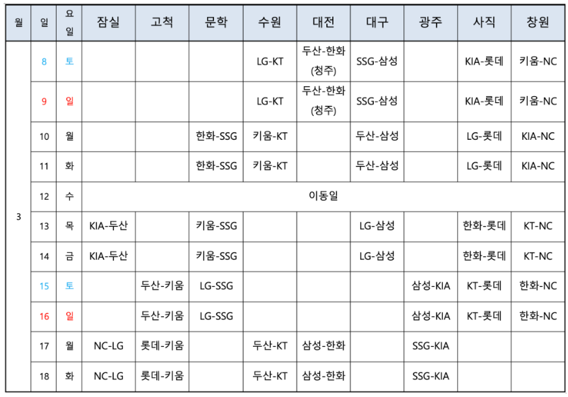 | 3.8.(토) 13:00 | 사직 | 기아 VS 롯데 |