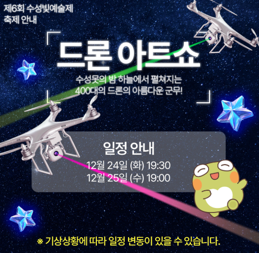 드론쇼는 12월 24일 25일 이틀간만 진행을 합니다. 수성ㅁ소의 밤 하늘에서 펼쳐지는 400대의 드론의 아름다운 군무를 감상할 수 있습니다.