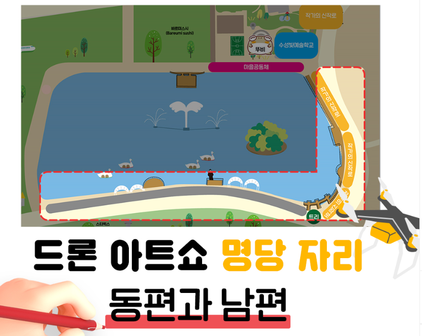 드론 아트쇼의 명당자리가 궁금하실 텐데요 수성빛축제 드론쇼의 명당자리는 수성못의 동편과 남편입니다.