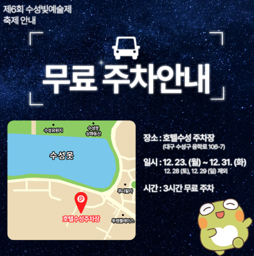 수성못은 항상 주차 때문에 걱정인데요 축제기간 주차는 호텔수성 주차장을 이용하시면 됩니다. 12월 23일부터 12월 31일기간동안 3시간 무료 주차가 가능합니다.