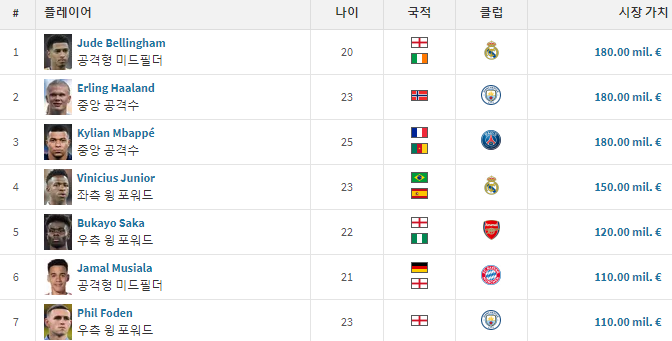 2024년 현재 트랜스퍼마켓에 가장 시장가치가 높은 축구선수 TOP7을 살펴보겠습니다.