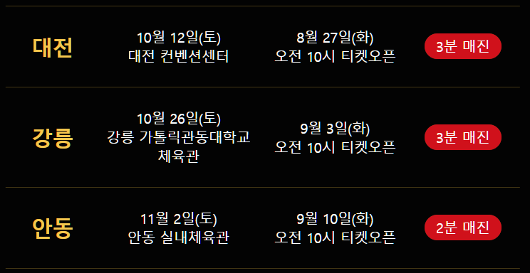 지난 8월과 9월에 있었던 대전, 강릉, 안동 티켓오픈일에 또다시 전석 매진이었는데 대부분 2~3분 이내에 예매가 끝났습니다.