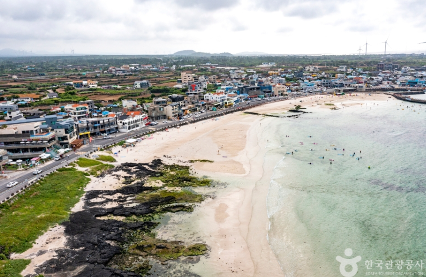 맑고 깨끗한 바닷물과 고운 백사장이 특징이며 주변에 넓은 잔디밭과 소나무 숲이 있어 피크닉 장소로도 인기입니다. 특히 해수욕장 근처에 위치한 곽지 과물은 천연 용천수로 시원한 물줄기가 흘러 더위를 식히기에 좋습니다. 여름철에는 해수욕과 함께 다양한 해양 스포츠를 즐길 수 있고, 샤워장, 탈의실 등의 편의시설도 잘 갖추어져 있어서 가족 단위 여행객들에게 인기가 많습니다. 평균 수심이 1.5m이고 경사도가 5~8도로 얕아 어린아이들과 함께 해수욕을 즐기기에 안전합니다.