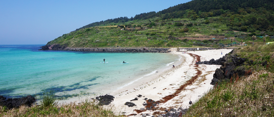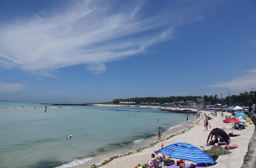 거대한 너럭바위 용암 위에 모래가 쌓여 만들어졌으며 하얀 모래에 부서지는 파도들이 시원한소리를 내고 코발트빛 바다 풍경이 제주 자연의 아름다움을 새삼 느끼게 해주는 곳입니다.