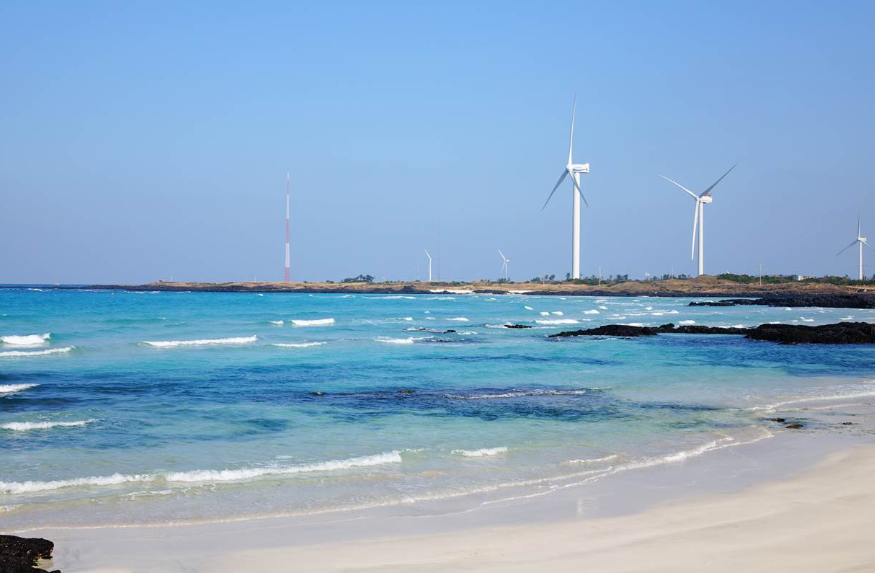 해변가를 걷다 보면 제주의 바람으로 돌아가는 김녕풍력발전기를 만나실 수 있고, 인근에는 갓돔과 노래미 돔이 잘 잡히는 갯바위 낚시터가 낚시꾼들에게 인기 명소입니다.