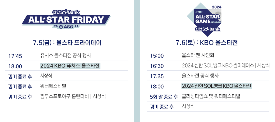 마지막 오후 6시가 되면 KBO 올스타전 경기가 펼쳐지는데요 KBO 팬들이 뽑은 리그 최고의 선수들이 모여 펼치는 별들의 축제입니다. KT, SSG, 두산, 롯데, 삼성이 홈팀으로 1루 더그아웃을 사용하고 LG, NC, KIA, 한화, 키움이 원정팀으로 3루 덕아웃을 사용합니다.