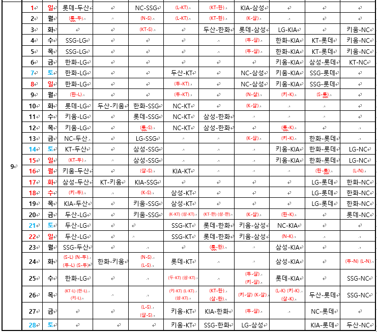 한국프로야구는 미편성 50경기와 우천순연 경기 등을 포함해 재편성이 필요한 52경기로 총 102경기를 9월 28일(토)까지 편성했습니다. 8월 17일(토)부터 8월 29일(목)까지 우천 등으로 인해 경기가 취소될 경우, 우선적으로 발표된 일정의 예비일로 편성되고, 예비일이 없을 시에는 9월 1일(일) 이후 동일 대진이 있는 경기의 경우 동일 대진 두 번째 날 더블헤더로 편성하고, 동일 대진이 없는 경기의 경우 추후 편성됩니다.