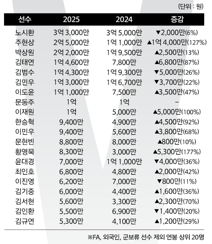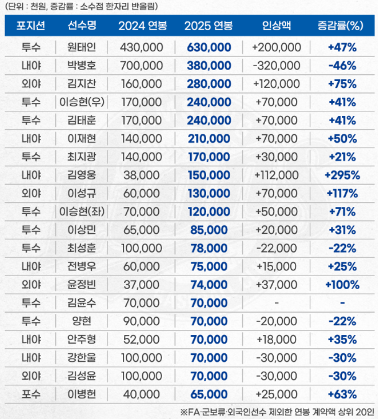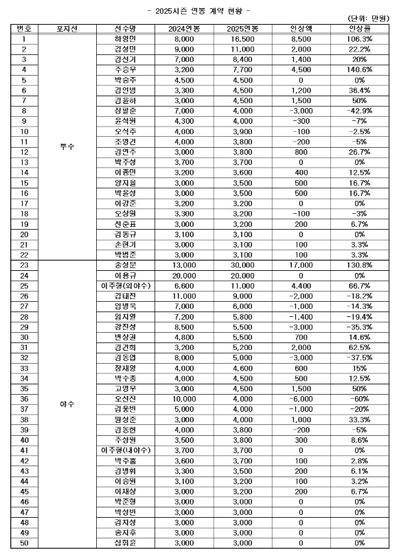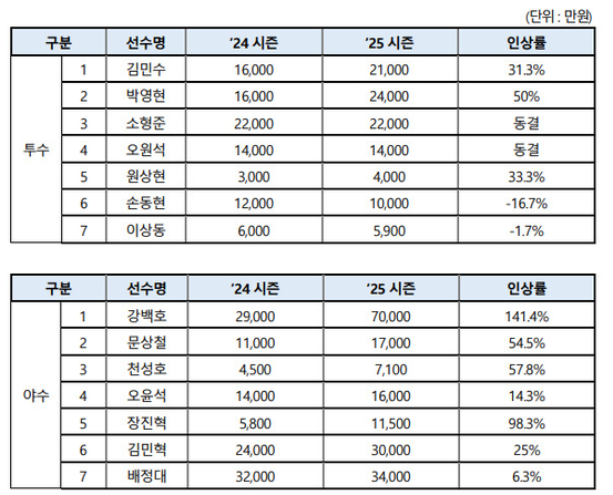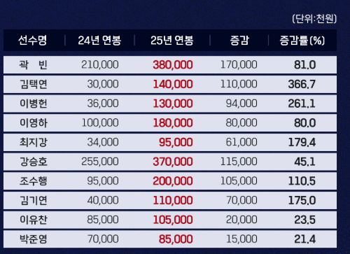 이는 2025년 KBO 리그 등록 선수 중 가장 높은 연봉 인상액입니다.