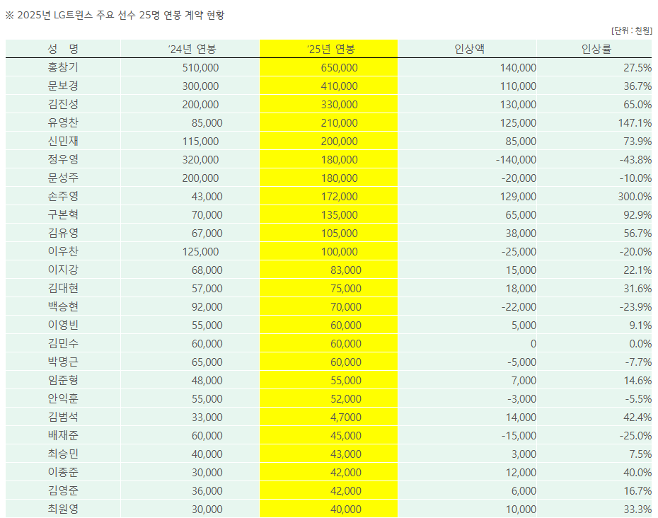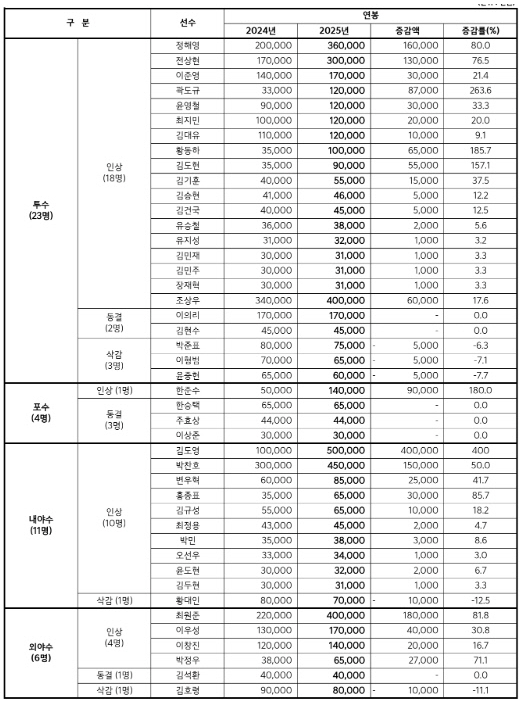 (신인 및 외국인 선수는 제외, 단위:만원)