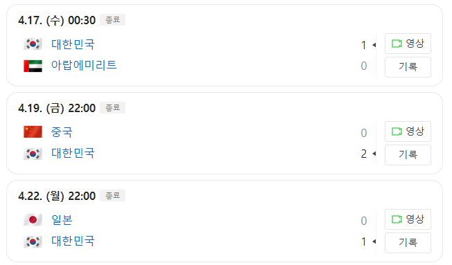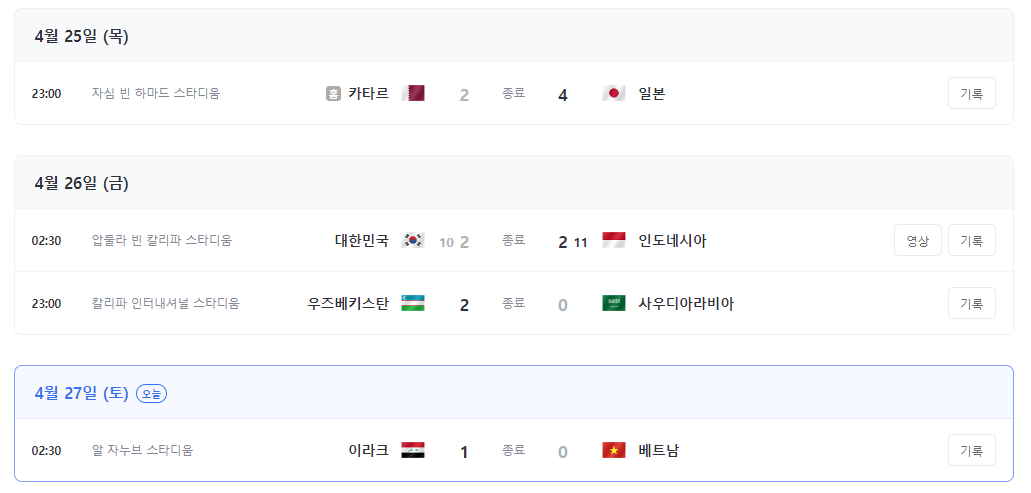 | 4월 25일(목) | 23:00 | 카타르 VS 일본 |