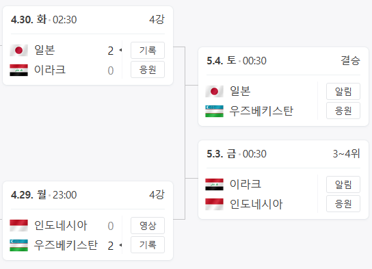 결승전은 일본과 우즈베키스탄이 5월 4일(토) 00:30분 맞붙습니다.